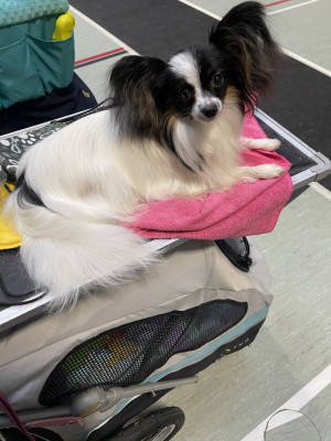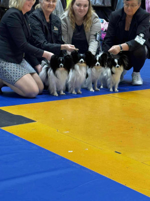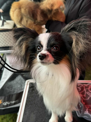 kritik: meget feminin helhed, udm ører fine franzer, mørke noget runde øjne, lidt æbleformet skalle, bra bid, kort hals, brystkorg i udvikling, noget faldende kors, udm silky pels, rør sig trangt bagfra, kort bag fra siden,